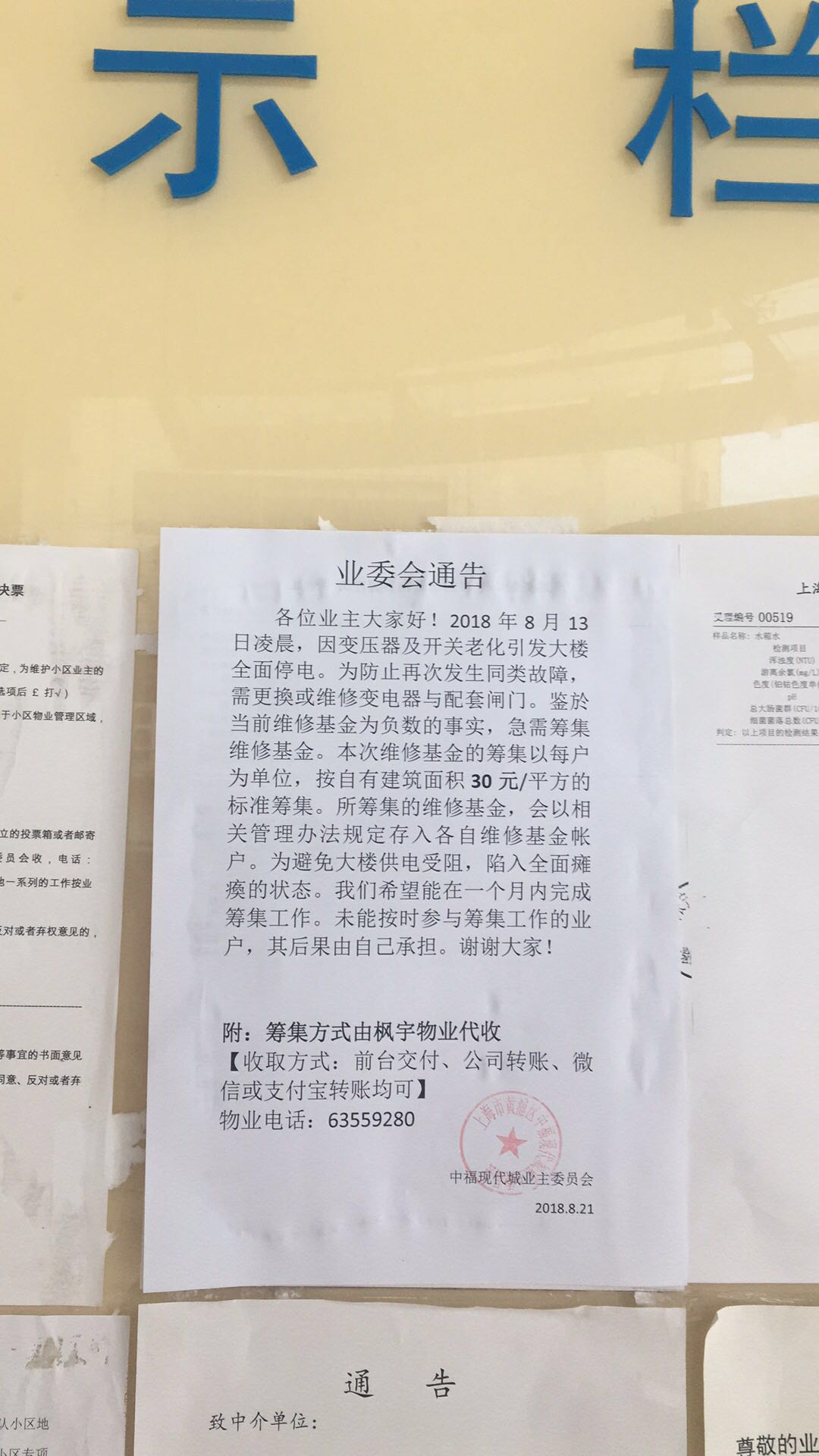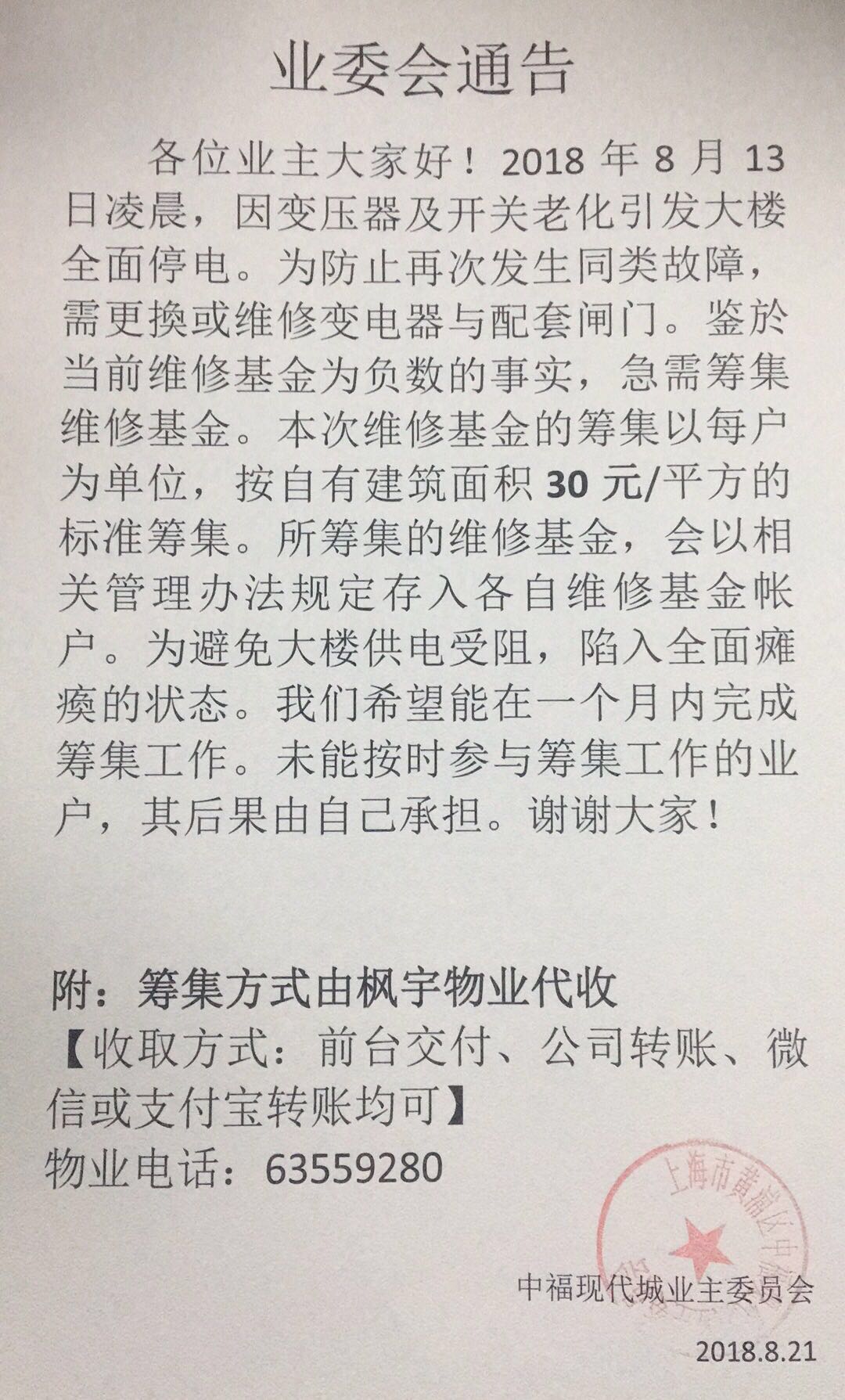 2018/09/01 关于急需筹集维修基金业委会通告