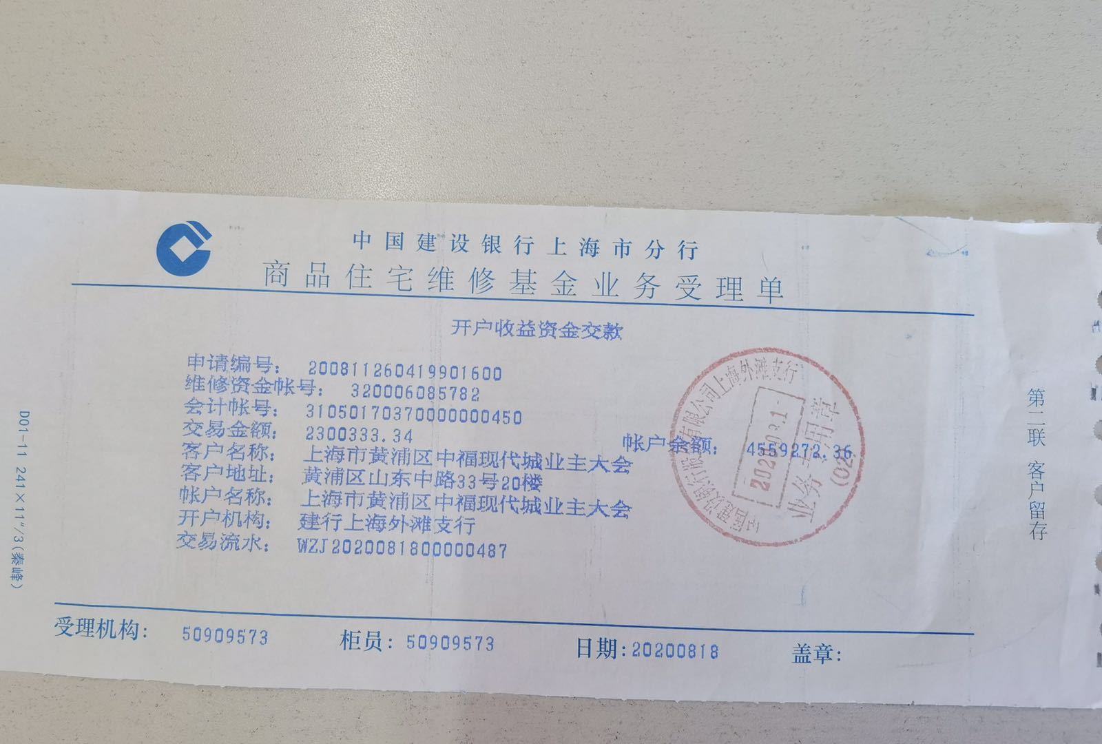2020/08/18 供业主查阅维修基金业主大会账户余额:4559272.36 照片
